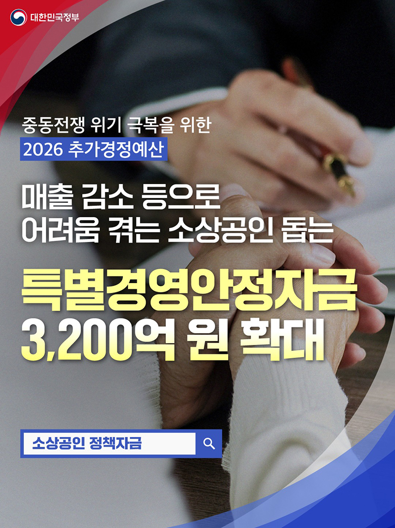 정부,중동전쟁 위기 극복을 위한 2026 추가경정예산···소상공인 돕는 특별경영안정자금 3200억 원 확대...