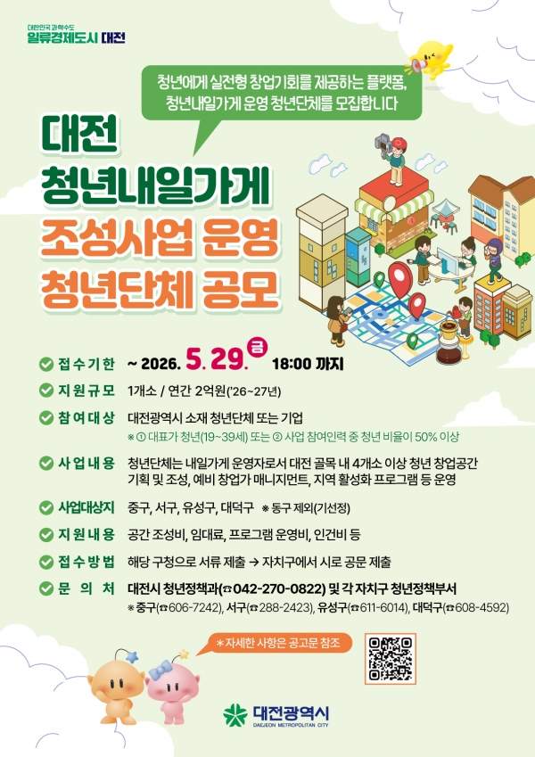 이번 공모는 이미 사업이 선정된 동구를 제외하고, 중구·서구·유성구· 대덕구 중 1개 자치구에 신규 내일가게 조성 운영단체를 선정하기 위해 진행된다. 신청 자격은 대표가 청년(19세~39세)이거나 사업 참여 인력 중 청년 비율이 50% 이상인 관내 청년단체 또는 기업이다. 선정된 운영단체에는 연간 2억 원씩 2년간 총 4억 원이 지원되며, 4개소 이상의 점포를 조성해 청년에게 3~6개월 단기 순환형 창업 기회와 컨설팅을 제공해야 한다.