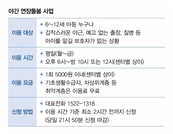지원 대상은 6세부터 12세까지 아동이다. 기존 이용 이력이 없어도 서비스 이용 2시간 전까지 신청하면 밤 10시 또는 자정까지 돌봄 서비스를 받을 수 있다.