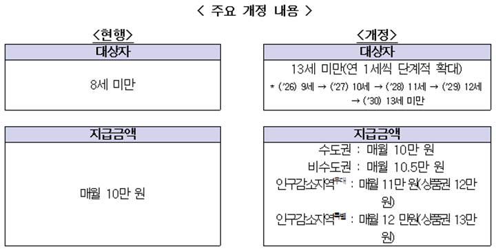 이번 개정은 지급 연령 확대와 지역별 추가 지원을 통해 아동 양육 부담을 완화하기 위해 마련됐다. 현재 아동수당은 8세 미만 아동에게 월 10만 원씩 지급하고 있으나, 개정에 따라 지급 연령을 13세 미만까지 매년 1세씩 단계적으로 상향한다. 이에 따라 대상 연령이 2030년까지 순차적으로 확대될 예정이다.