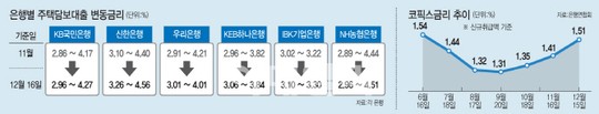 시중 은행이 주담대 변동금리를 일제히 올린 것은 최근 은행연합회가 11월 신규 취급액 기준 코픽스를 전월대비 0.1%포인트 오른 1.51%로 고시한 데 따른 것이다. 코픽스 금리는 국내 9개 은행의 정기 예·적금, 상호부금 등의 수신금리를 잔액 비중에 따라 가중평균해 한달에 한번 나온다. 매월 중순 코픽스 금리가 고시되면 은행들은 이튿날 변동금리를 올리고 이를 한 달간 적용한다. 초저금리 시대를 맞아 내리막길을 걷던 코픽스금리는 9월 연 1.31%를 저점으로 반등해 석 달 새 0.2%포인트 올랐다.