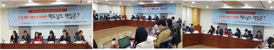 <내외매일뉴스=정완태 과학전문기자> 국회 보건복지위원회 권미혁·기동민 의원 공동 주최, 소비자와함께·환경보건시민센터·한국소비자정책교육학회 주관으로‘오염 패티 햄버거 판매한 맥도날드 책임은? 식품안전 정책토론회’가 국회의원회관 제9간담회의실에서 「햄버거병 사건 제도개선 방안」을 논의하기 위하여 열렸다.