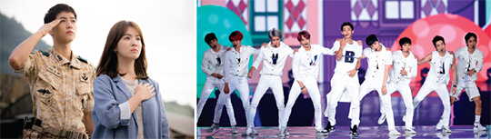 한국 드라마, 한식, K-팝, K-웹툰 등을 통해 전 세계에서 한국 문화에 대한 관심이 높아지고 한국어를 배우려는 외국인이 늘어나고 있다. 사진은 올해 한류 재점화를 이끈 드라마 ‘태양의 후예’와 K-팝을 대표하는 아이돌 그룹 EXO.