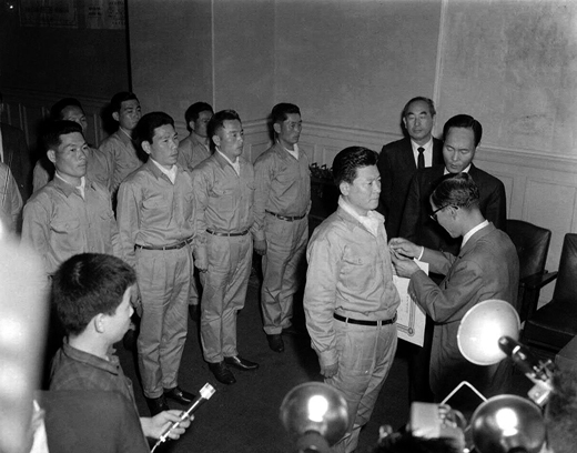 1966년 엄민영 내무부장관이 독도경비대원에게 표창장을 수여하고 있다.