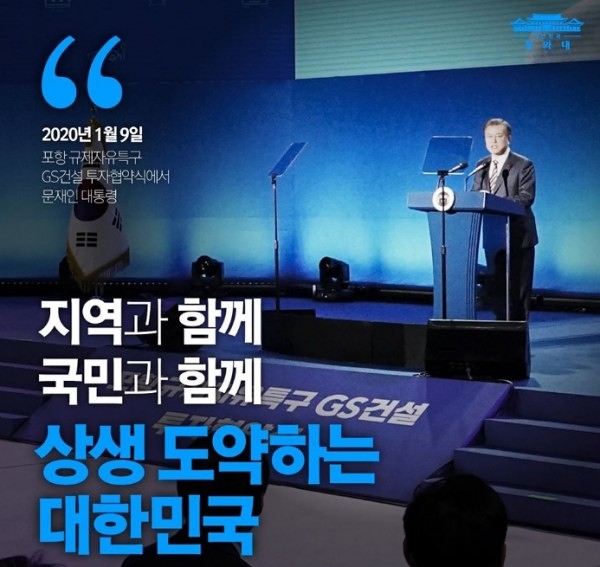 문 대통령은 이날 오전 경북 포항 포항종합운동장 실내체육관에서 열린 ‘포항규제자유특구 GS건설 투자협약식’에 참석, 축사를 통해 이같이 밝혔다.