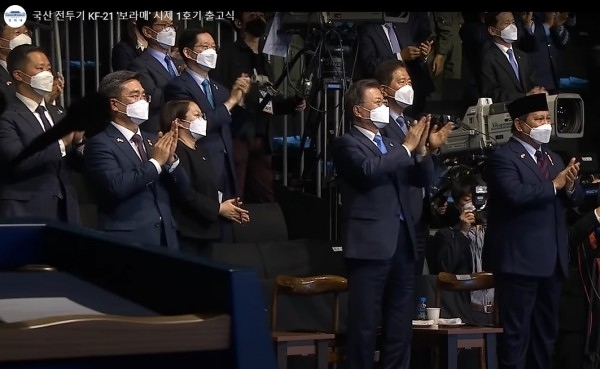문재인 대통령이 9일 경남 사천시 한국항공우주산업(KAI) 고정익동에서 열린 한국형전투기 보라매(KF-21) 시제기 출고식에서 참석자들과 함께 박수를 치고 있다. (사진=청와대)