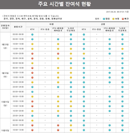 코레일,2017년 추석 기차표 남은 좌석현황...