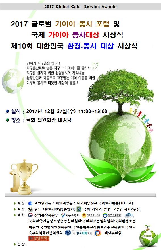 2017 가이아 봉사대상 및 제10회 대한민국 환경봉사대상 시상식이 12월 27일 오전 11시부터 오후 1시까지 국회의원회관 대강당에서 실시된다고 행사 조직위원회는 밝혔다. 참석자들은 신분증을 지참해야지 들어갈 수 있고 가족들과 축하객들도 반드시 신분증 지참해야 된다.