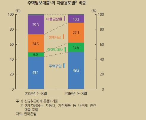 한은이 올해 1∼8월 8개 시중은행이 취급한 주택담보대출의 자금 용도를 분석한 결과, 생계자금 비중이 27.1%로 작년 같은 기간 24.5%보다 2.6%p 올라갔다.